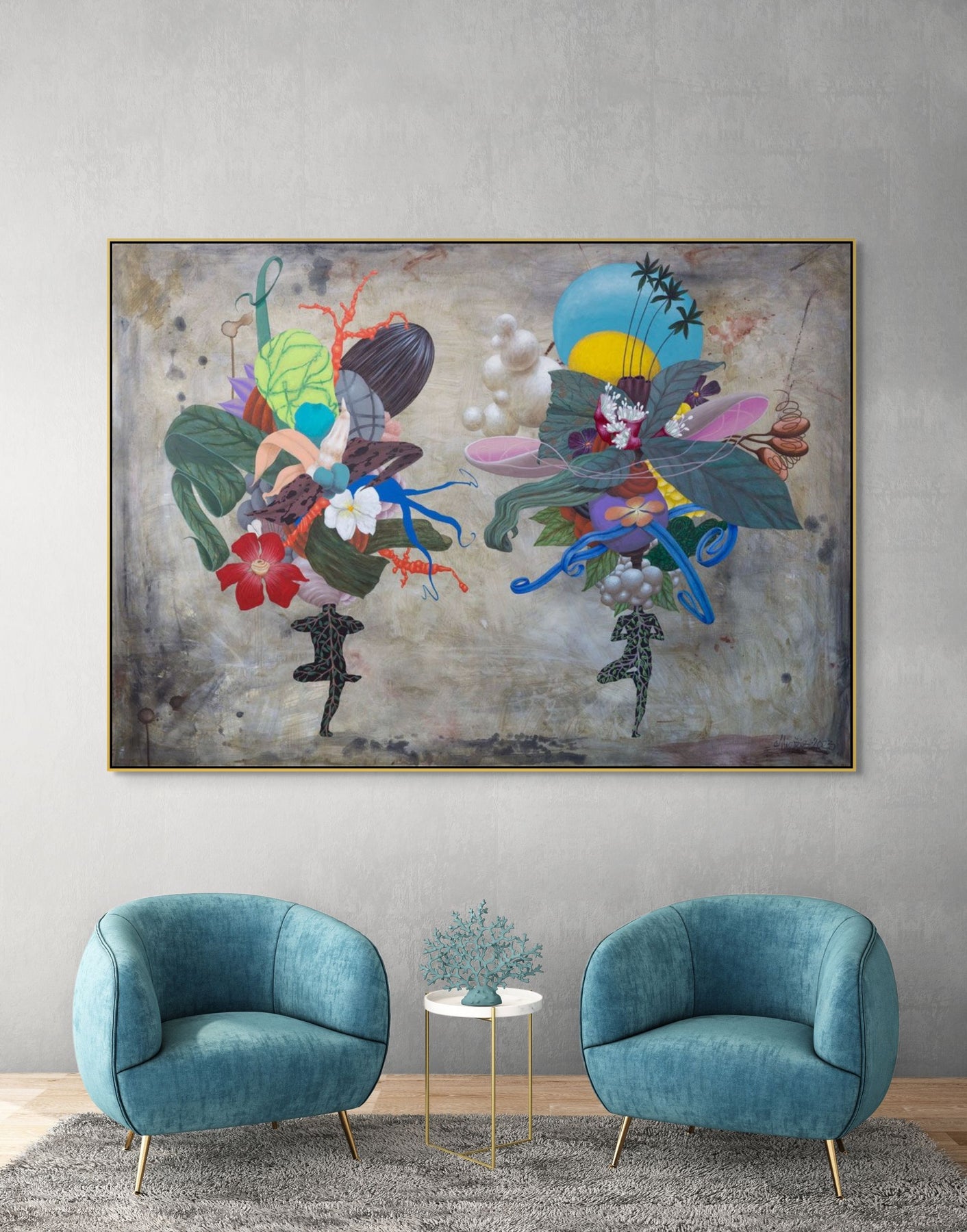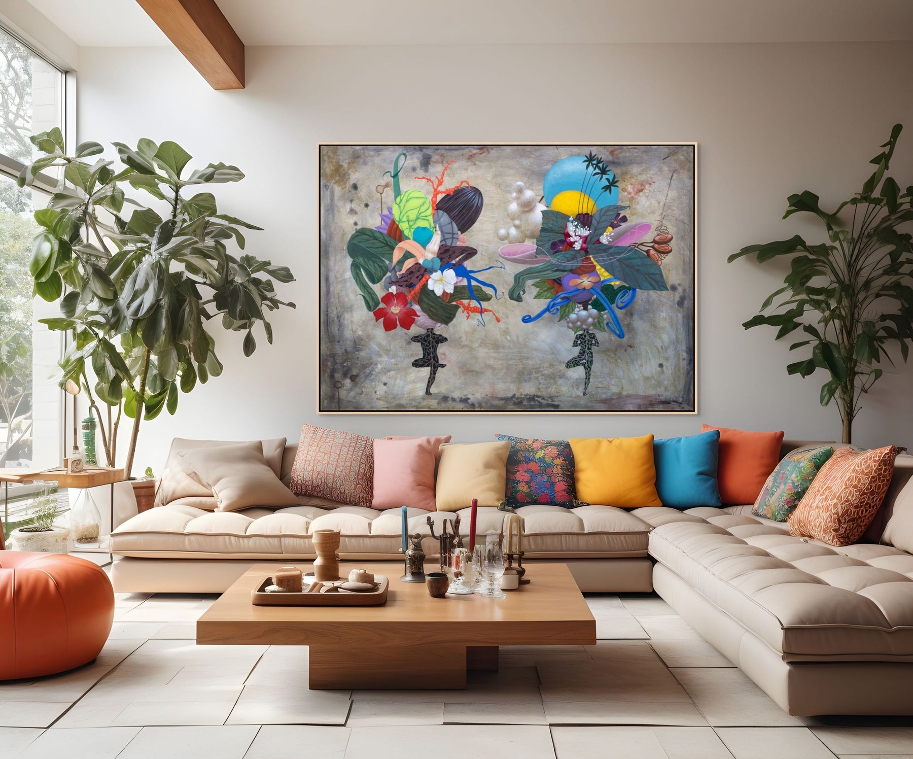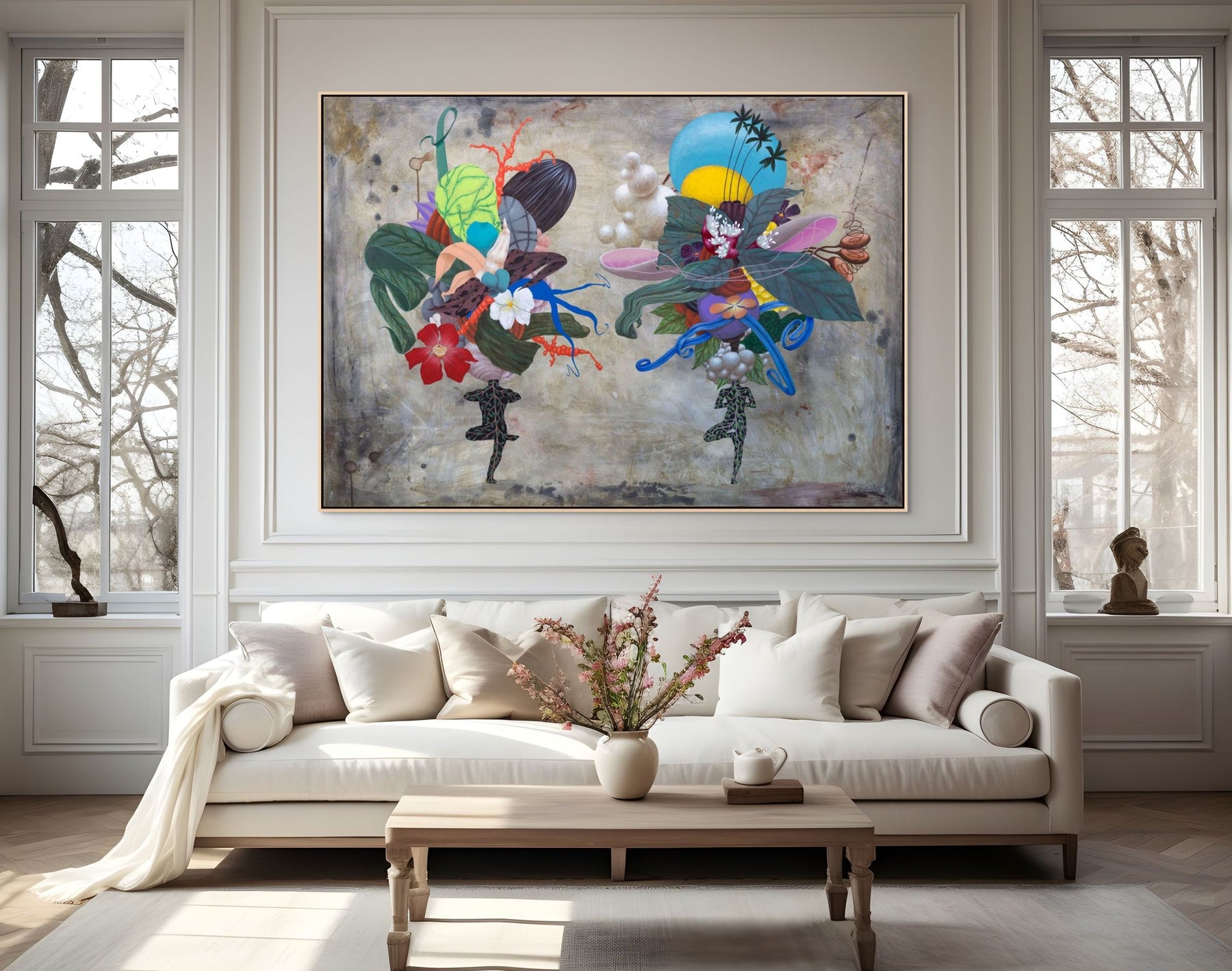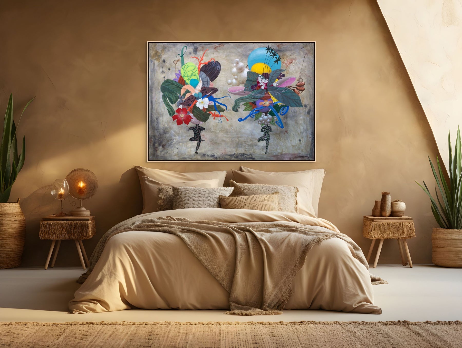 Each element feels alive: tropical blues and reds pulse with energy; delicate whites breathe serenity; emerald greens spiral upward like oxygen in motion. The background - softly aged and raw - contrasts with the abundance of color, grounding the piece in a sense of timelessness, as if painted on a wall of memory.