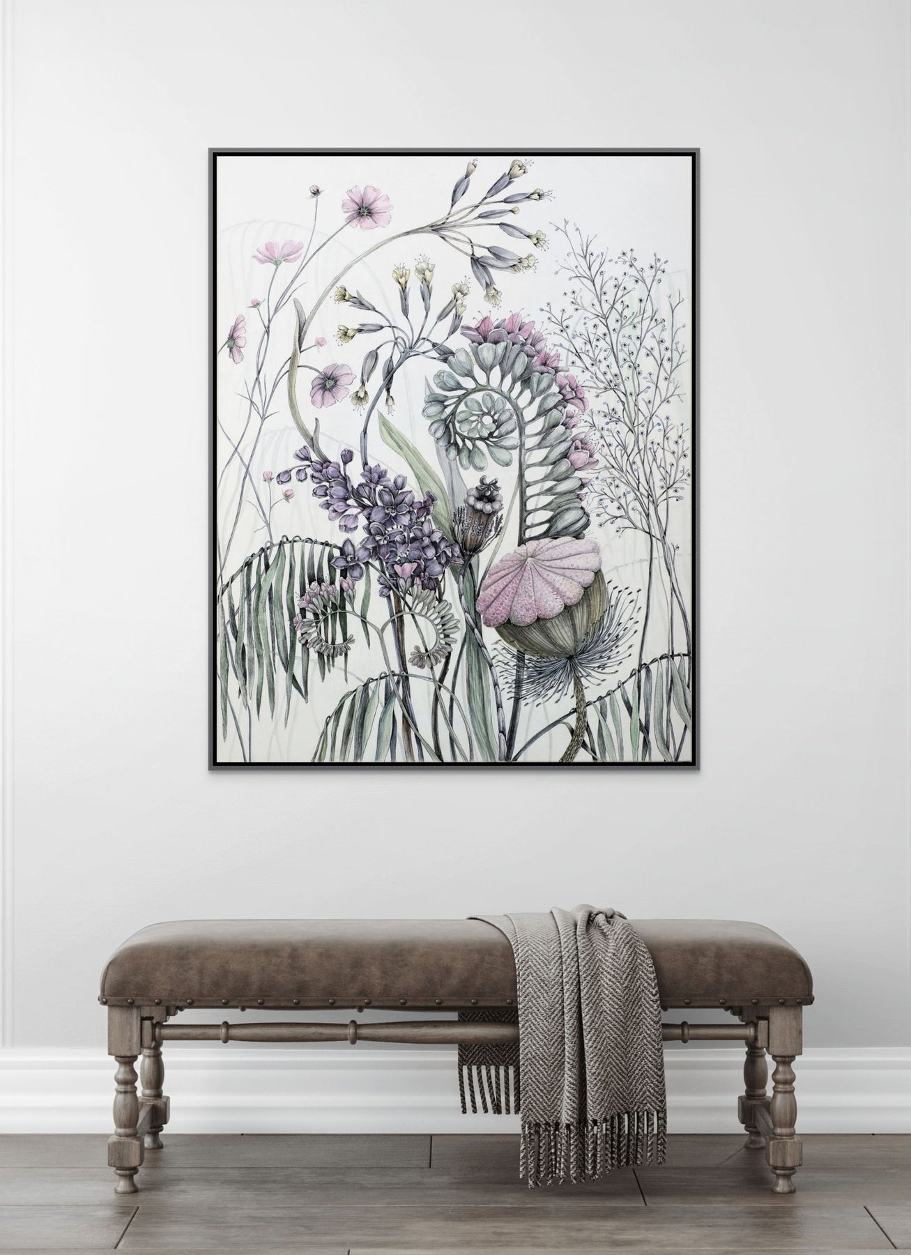 Framed floral artwork on a wall above a bench with a blanket.