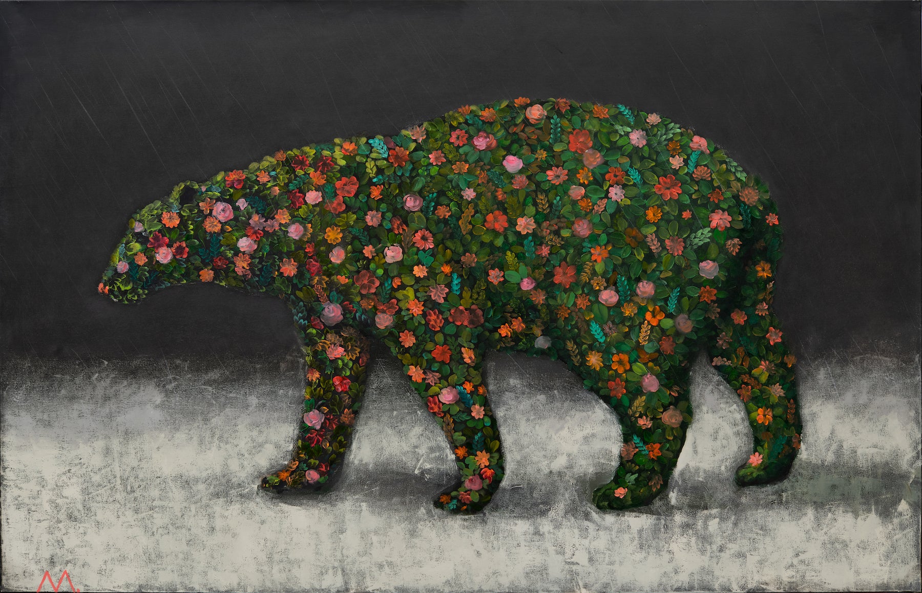 The composition’s balance between shadow and bloom is deliberate. The muted grays and silvers of the background evoke the chill of winter rain, while the bear’s skin of flowers radiates warmth and hope. The contrast between darkness and color mirrors the emotional landscape of endurance - how optimism, fragile yet fierce, glows most vividly against adversity. Kosinskaite’s delicate brushwork makes the bear appear almost illuminated from within, its floral patterns like tiny constellations of life.