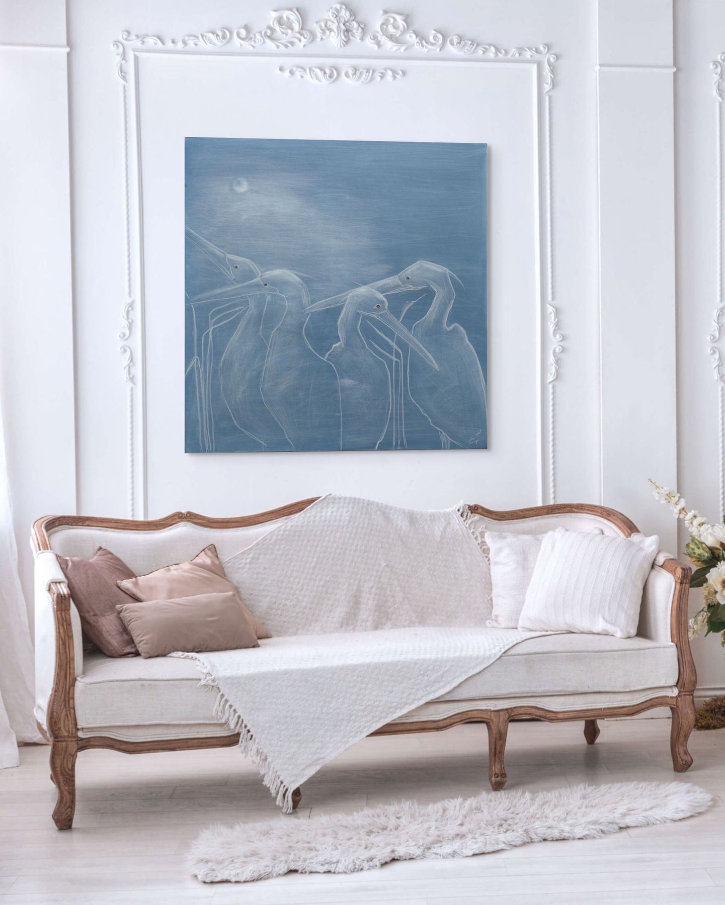 In Zivile Rudzikaite-Matuzoniene’s Cranes I, silence feels architectural. A cool, lunar light lifts from water and gathers along the tall, patient bodies of the birds. They stand in a near-monochrome dusk, necks describing slow calligraphy, beaks tuned to a horizon that has not yet committed to dawn. The air is pale and mineral, the palette restrained, as if the painter has removed everything unnecessary so we can hear the first thought arrive.