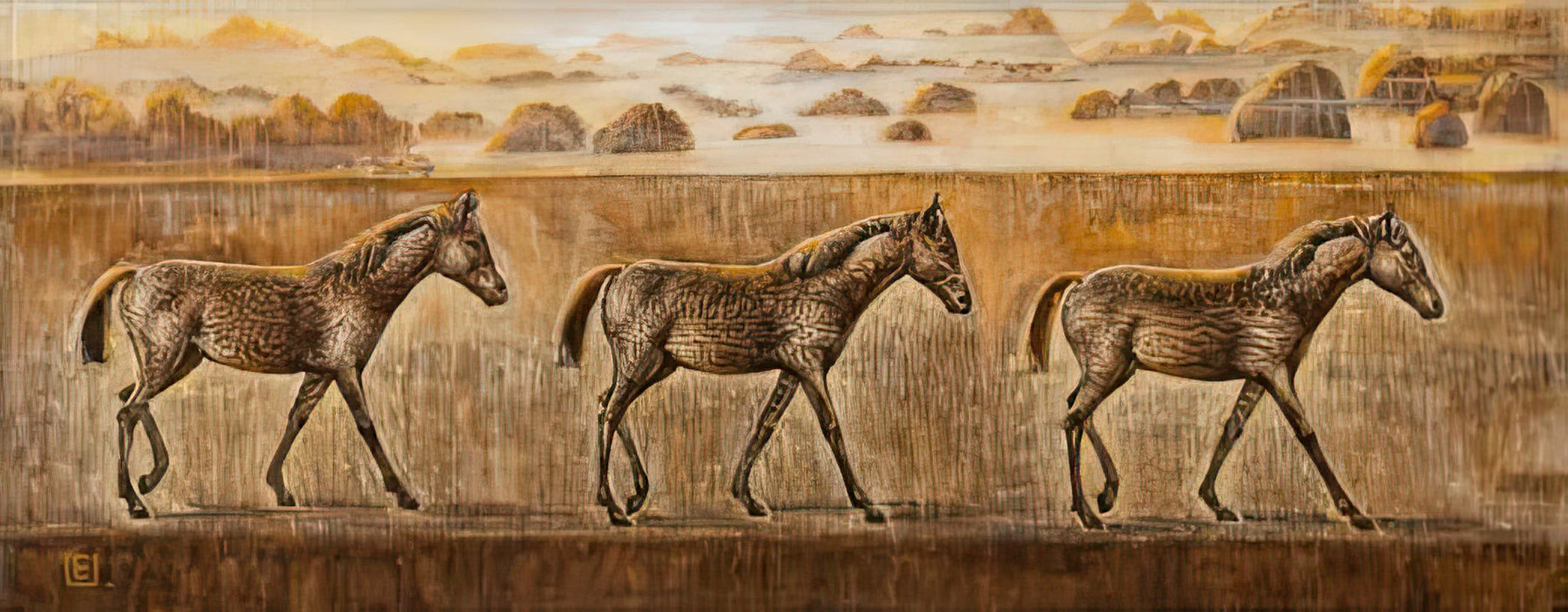 The artist’s signature textural language transforms the landscape into something sacred and dreamlike. Layers of ochre, honey, and faded gold blend with delicate hints of light, evoking the warmth of dawn as it touches the land. The horses themselves appear both real and symbolic - guardians of ancient wisdom, embodiments of motion made eternal. Their patterned coats shimmer like engraved prayers, each curve an inscription of endurance and quiet dignity.