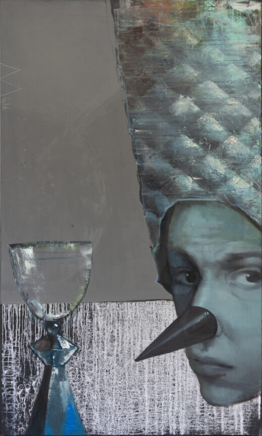 Beside the figure rests a fragile glass, its stem elongated like an hourglass, shimmering with the faint suggestion of time passing. The face, half hidden yet intensely present, looks outward with an expression that holds both caution and resignation. The exaggerated nose, sharp as a blade, breaks the softness of the surrounding textures and becomes a symbolic line drawn between truth and illusion, between delicacy and confrontation.