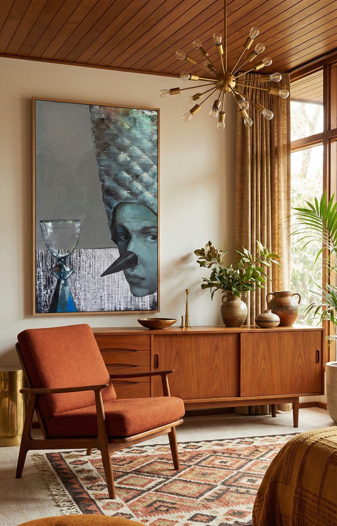 Living room with wooden furniture, orange armchair, and decorative elements.