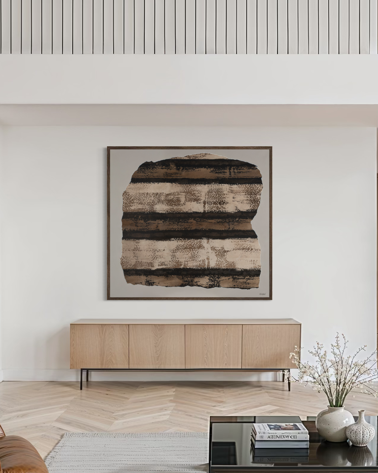 Monika Zajarskiene’s Layers is a grounded meditation on accumulation - a composition shaped by horizontal bands that unfold like sediment slowly formed over time. Deep browns, charcoals, and muted mineral beiges stretch across the surface in rhythmic intervals, creating a visual cadence that feels steady, elemental, and enduring. The torn, organic edges reinforce the sense that this form has not been constructed, but revealed - as though lifted directly from the earth.