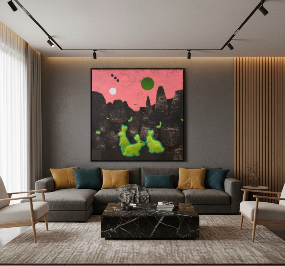 The rabbits themselves seem caught mid-story, their luminous bodies signaling both innocence and alertness. They gather in a landscape that feels at once natural and invented - a place where mountains mimic shadows, and shadows mimic memory. The contrast between the electric greens and the earthy blacks creates a tension that feels alive, as if the ground beneath them might shift at any moment. The sky’s strange geometry reinforces this sense of movement, a universe that never settles.