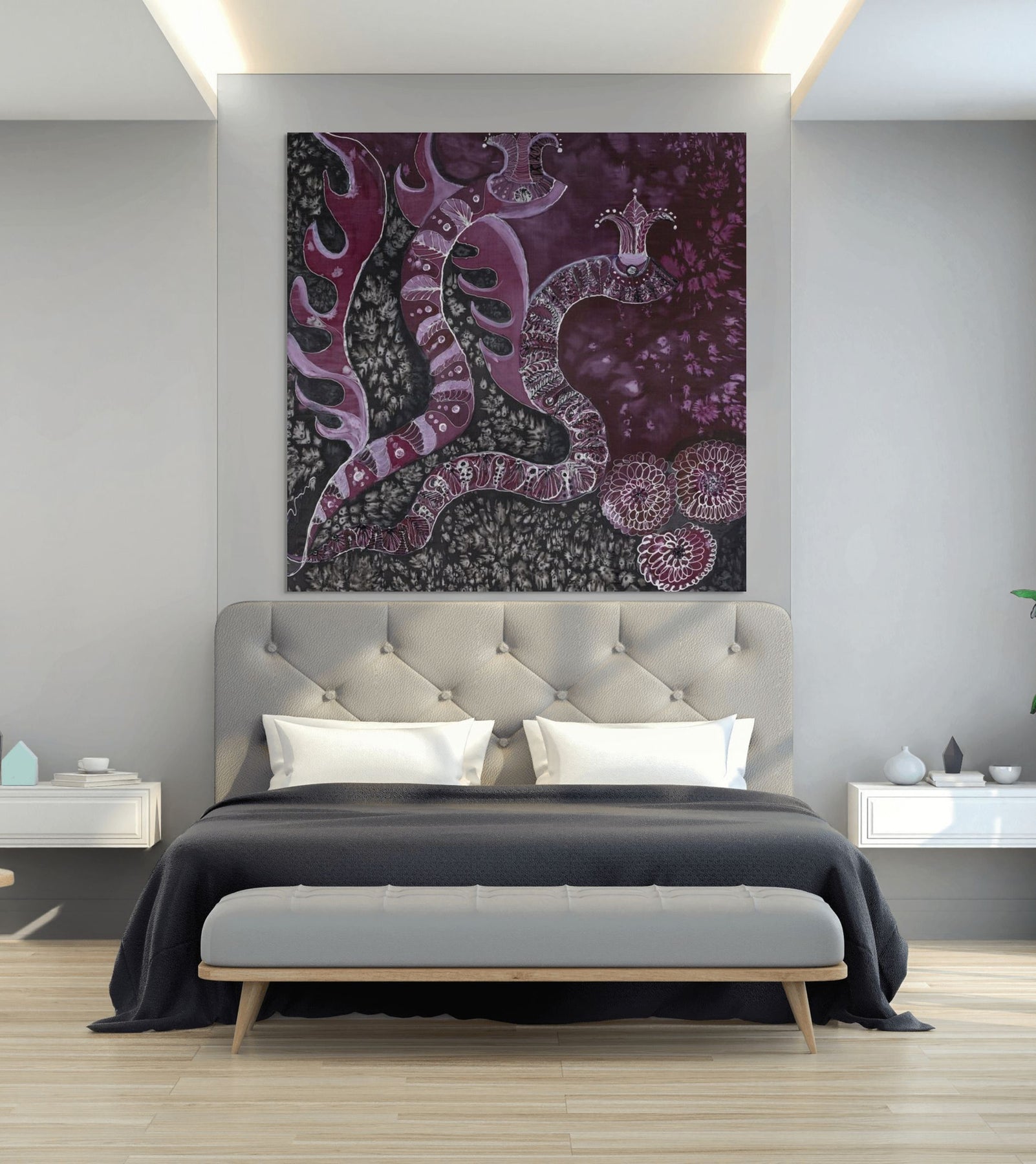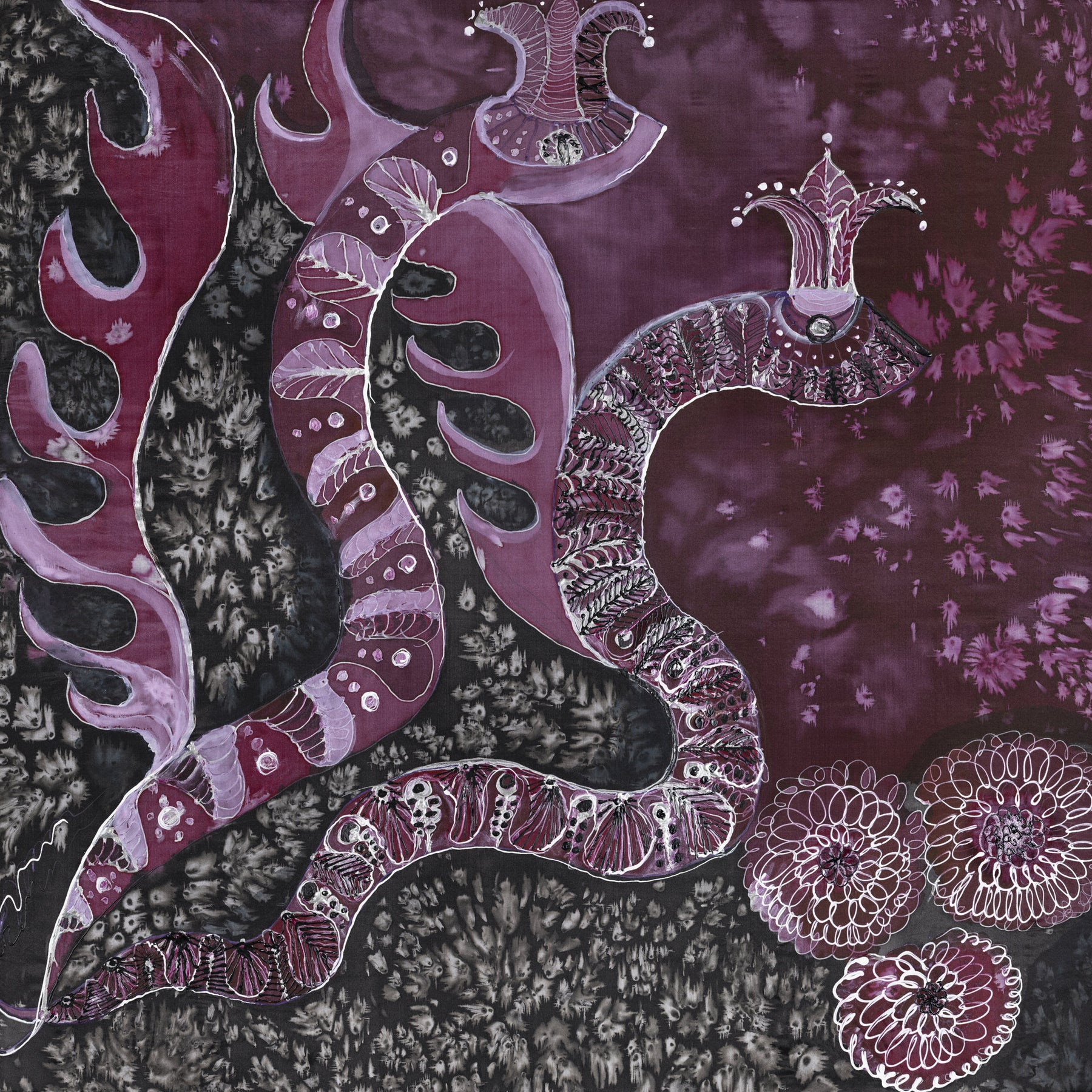 Nijole Stunskaite-Vilke’s Oratory unfolds like a visual incantation - an artwork where form and color seem to voice something ancient, ceremonial, and deeply alive. Undulating serpentine shapes move across a tapestry of rich purples, wines, and charcoal blacks, their bodies adorned with intricate patterns that resemble sacred markings or symbolic script. Each curve feels intentional, as though tracing the path of a chant or the rise and fall of a spoken prayer.