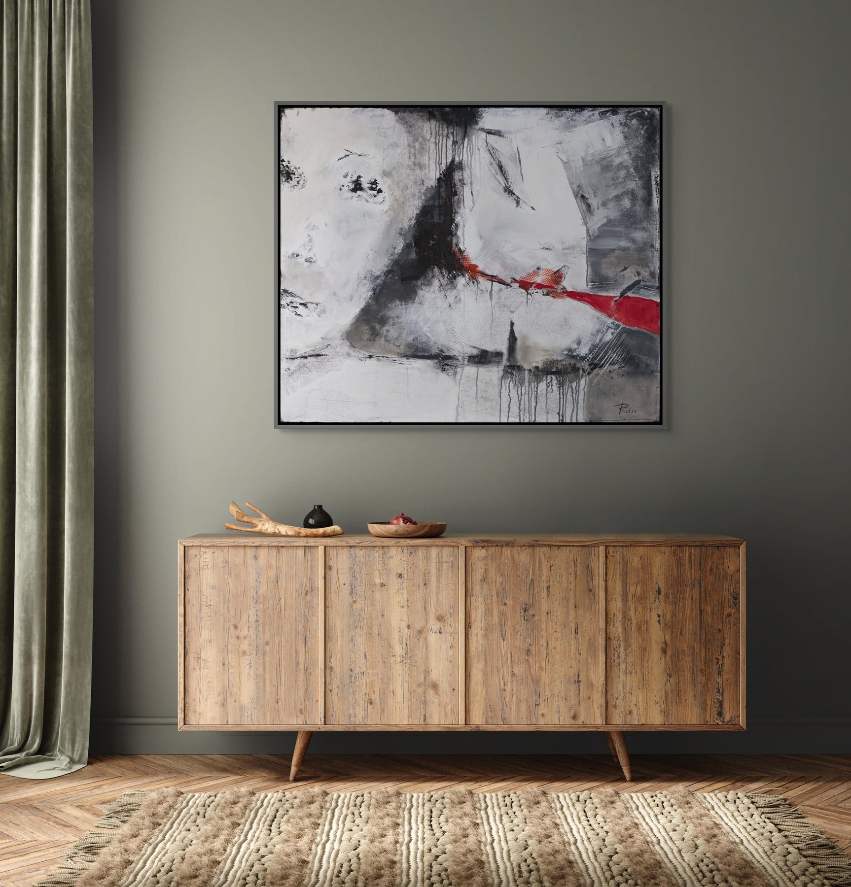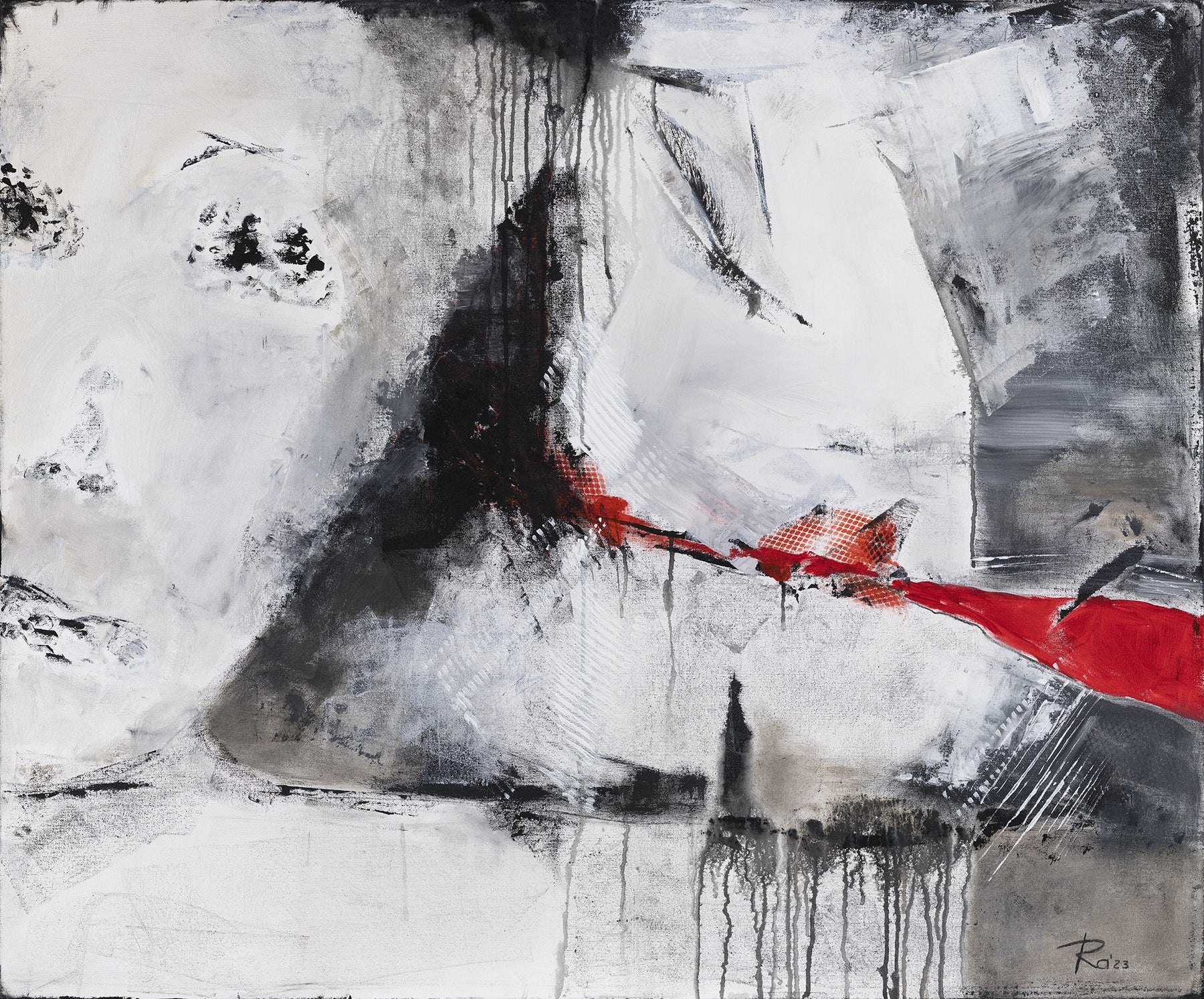 The artist’s composition is meticulously balanced - the boldness of the red contrasts against the delicate gradations of white and grey, evoking a quiet battle between passion and composure. Drips, textures, and broken gestures reveal traces of human vulnerability, while the surrounding emptiness heightens the sense of isolation. The piece holds its silence firmly, yet within that silence, emotion trembles like a note sustained in air.