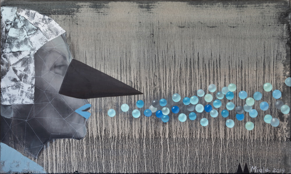 In Migle Kosinskaite’s work, Bubbles shows a figure with a geometric, bird-like mask releasing a stream of bright blue circles. The scene feels imaginative and slightly playful, as if the person is sending small thoughts or breaths of color into the air. The muted grays of the figure make the blue bubbles stand out even more.