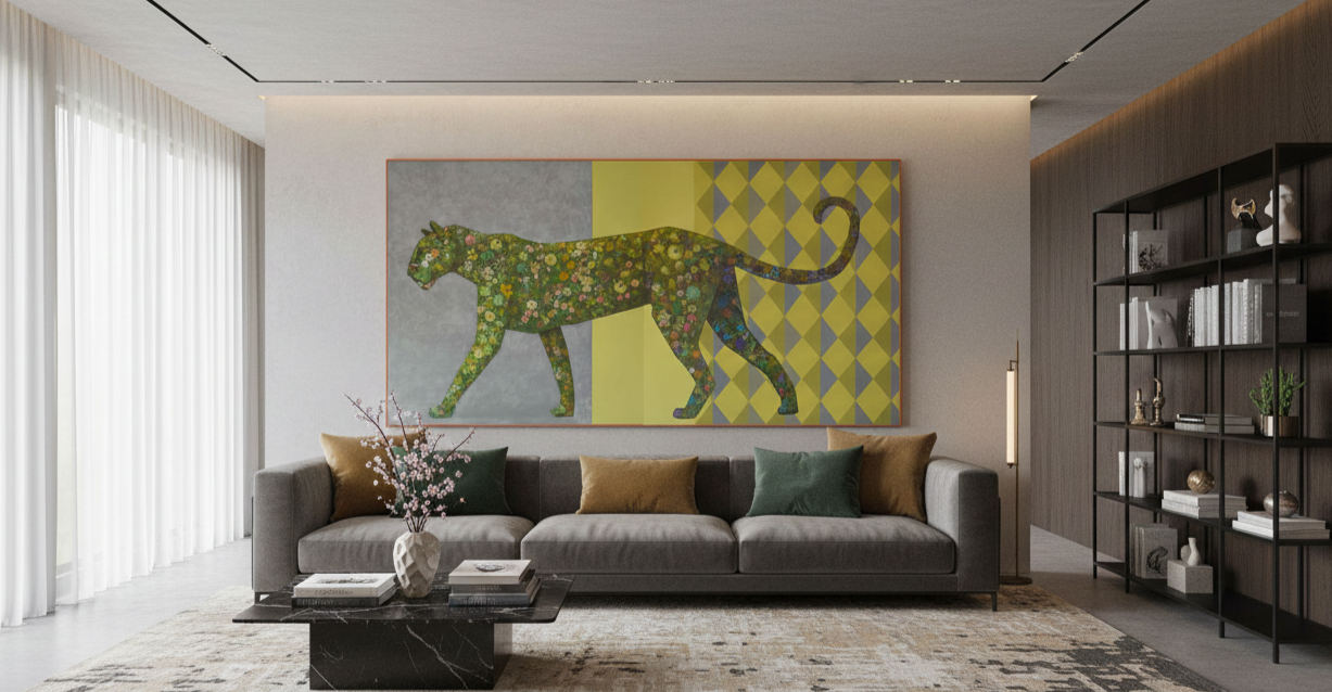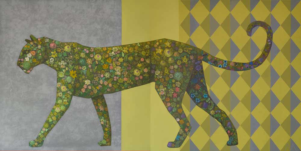 Migle Kosinskaite’s Florist unfolds like a quiet, modern fable, where the natural world blends seamlessly with pattern and imagination. A slender cat strides across the canvas, its entire form blossoming with floral motifs that suggest a creature grown from gardens rather than born from the wild. The scene feels suspended between stillness and movement - a moment caught mid-stride, glowing with gentle curiosity.